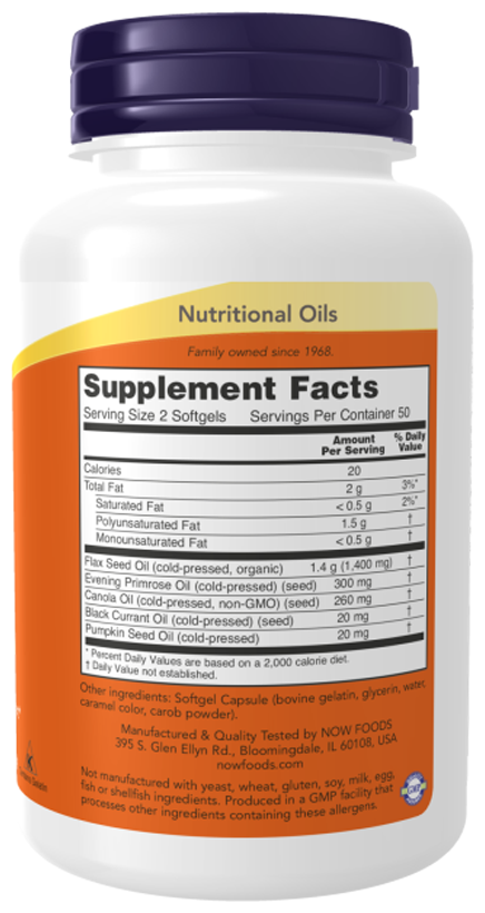 Омега 3-6-9 представляет собой смесь масел семян льна, первоцвета вечернего, канолы, черной смородины и тыквенных семечек. Now сочетает в себе эти известные питательные масла для создания сбалансированных пропорций жирных кислот омега-3, омега-6 и омега-9. Омега-3, альфа-линоленовая кислота (АЛК) и омега-6, ГЛК, играют важную роль в поддержании здоровья кожи и функции иммунной системы. Пищевая олеиновая кислота, мононенасыщенная жирная кислота омега-9, связана со здоровьем сердечно-сосудистой системы.