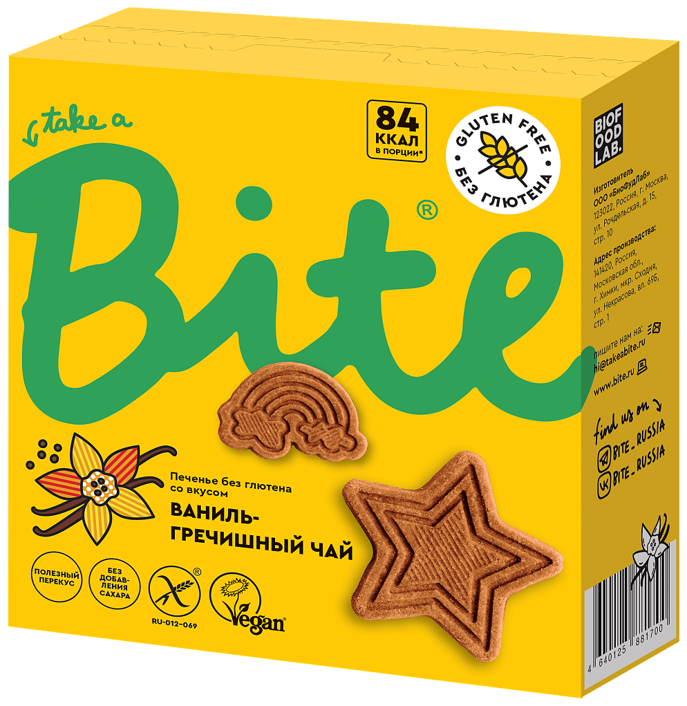 Хрустящий вкус и нежная текстура, ванильные нотки и пряный гречишный чай — и это далеко не все особенности печенья без глютена. Чтобы создать его, мы обратились с команде разработчиков Bite. В первоклассную муку без глютена мы добавили чай татарской гречихи и ваниль, немного финикового сиропа для сладости и яблочного порошка для пользы. Получилось натуральное печенье без добавленного сахара и глютена, обогащённое кальцием — изысканный и здоровый снек! И всего 84 ккал в порции (84 г)! Печенье подходит веганам и потребилетям с целиакией (сертификат «Перечеркнутый колос» от сообщества «Эмилия»).